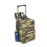 Standard camo style, wheeled travel pack is constructed of 600 thread count Denier weather resistant PVC backed polyester. A comfortable padded back pack straps. Also featured 2 front-load main compartments, 2 quick access zippered front pockets, convenient grab handle. In addition a two-stage locking telescope handle, mesh side pockets with shock cord closure, protective foam padding thought out. This is FDA approved carry size of apr. 20"x14"x8".