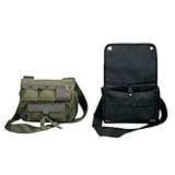Heavyweight canvas outer , water-repellent nylon interior , 10" x 11" x 5" , 2 internal compartments with 4 organizational pockets , heavy G.I. Latching buckle , heavy duty adjustable nylon strap , rear pocket , flip up 4 compartment front pouches , side