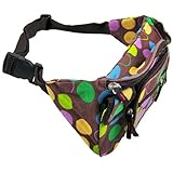 This awesome brown canvas waist pack has a multicolored polka dot print. The bag features a mesh water bottle pocket and 2 zipper pockets on the front, has a large main compartment and even has a cell phone holder. It quickly unzips to give you access to your belongings. The fanny pack is brand new, never used, and makes a great gift for friends and family. The adjustable strap fits waists up to 43 inches. We have a limited supply of these, so don't miss out. Get yours today!